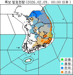 o 한파경보 : 경기도(동두천, 연천, 포천, 가평, 양주, 파주), 강원도(태백, 영월, 평창평지, 정선평지, 횡성, 철원, 화천, 홍천평지, 춘천, 양구평지, 인제평지, 강원북부산지, 강원중부산지, 강원남부산지), 경상북도(경북북동산지)