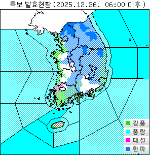 o 한파주의보 : 경기도(광명, 과천, 김포, 동두천, 고양, 양주, 의정부, 수원, 성남, 구리, 남양주, 오산, 의왕, 하남, 용인, 이천, 안성, 여주, 광주, 양평), 강원도(철원, 양구평지, 인제평지, 강원중부산지 제외), 충청남도(천안, 공주, 청양, 계룡), 충청북도(제천 제외), 전라남도(곡성, 구례, 화순, 고흥, 보성, 광양, 순천), 전북자치도(진안, 무주, 장수, 임실, 순창, 남원), 경상북도(고령, 경북북동산지 제외), 경상남도(양산, 밀양, 창녕, 하동, 산청, 함양, 거창, 고성), 서울, 인천(강화), 대구, 부산(부산동부, 부산중부), 울산(울산서부), 세종