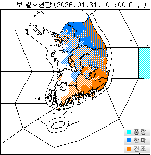 o 한파주의보 : 경기도(과천, 안산, 시흥, 김포, 동두천, 고양, 양주, 의정부, 파주, 수원, 구리, 남양주, 오산, 평택, 의왕, 하남, 용인, 이천, 안성, 여주, 광주, 양평), 강원도(원주), 충청남도(천안, 공주, 청양, 계룡), 충청북도(청주 제외), 전북자치도(진안, 무주, 장수), 경상북도(고령, 성주, 상주, 문경, 예천, 안동, 영주, 청송, 영양평지, 울진평지, 포항), 서울(서울동남권 제외), 인천(강화), 대구(군위)