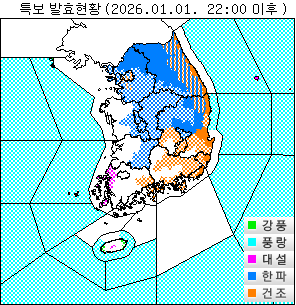 o 한파주의보 : 경기도(동두천, 연천, 포천, 가평, 양주, 파주 제외), 강원도(영월, 원주), 충청남도(천안, 공주, 논산, 금산, 청양, 계룡), 충청북도, 전북자치도(진안, 무주, 장수, 임실, 순창, 남원), 경상북도(상주, 문경, 예천, 안동, 영주), 서울, 인천(옹진군 제외), 대전, 대구(군위), 세종