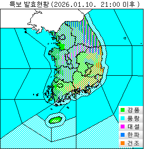 o 한파주의보 : 경기도(안산, 오산, 평택, 화성 제외), 강원도(강릉평지, 동해평지, 삼척평지, 속초평지, 고성평지, 양양평지, 영월, 횡성, 원주, 홍천평지, 춘천), 충청남도, 충청북도, 전라남도(고흥, 장흥, 강진, 해남, 완도, 영암, 무안, 영광, 목포, 진도, 흑산도.홍도), 전북자치도, 경상북도(의성, 영양평지), 경상남도(창원, 통영, 사천), 서울, 인천(옹진군 제외), 대전, 부산, 울산(울산서부), 세종