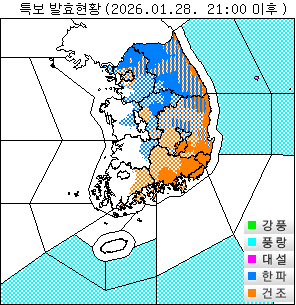 o 한파주의보 : 경기도(과천, 안산, 시흥, 김포, 고양, 의정부, 수원, 구리, 오산, 평택, 의왕, 하남, 용인, 이천, 안성, 여주, 광주, 양평), 강원도(원주), 충청남도(천안, 공주, 청양, 계룡), 충청북도(보은, 옥천, 영동, 충주, 진천, 음성, 단양, 증평), 전북자치도(진안, 무주, 장수), 경상북도(고령, 상주, 문경, 예천, 안동, 영주, 청송, 영양평지, 포항), 서울(서울동남권 제외), 인천(강화), 대구(군위)