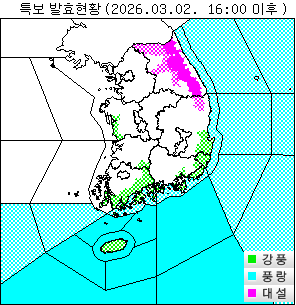 o 대설경보 : 강원도(태백, 강원북부산지, 강원중부산지, 강원남부산지)